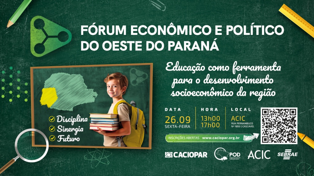 O futuro da educação no Oeste do Paraná estará no centro das atenções no próximo dia 26 de setembro, quando será realizado o 2º Fórum Econômico e Político do Oeste do Paraná, na Acic, em Cascavel. A iniciativa é da Caciopar em parceria com o Programa Oeste em Desenvolvimento, Sebrae, Acic, e apoio da Amop, Acamop,Conselhos de Desenvolvimento e diversas outras entidades regionais.