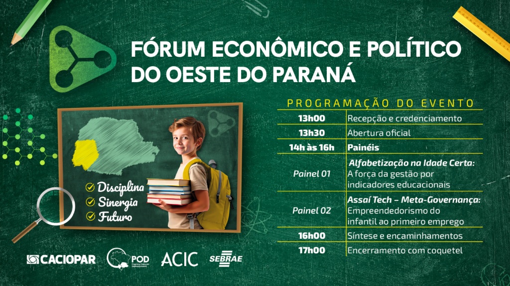Além dos painéis, o fórum do próximo dia 26 prevê momentos de interação, síntese e encaminhamentos práticos. “Será uma oportunidade rara de trocar experiências com especialistas que já provaram, na prática, que é possível revolucionar a educação por meio de gestão eficiente, inovação e visão estratégica”, afirma o presidente do POD e ex da Caciopar, Alci Rotta Júnior. “Queremos reforçar convite à região Oeste, empresários, autoridades, prefeitos, secretários municipais de educação, chefes dos núcleos de educação, presidentes de câmaras de vereadores e integrantes do sistema associativo do Oeste, para que venham ao evento e participem nesse debate tão relevante ao futuro da nossa região”.