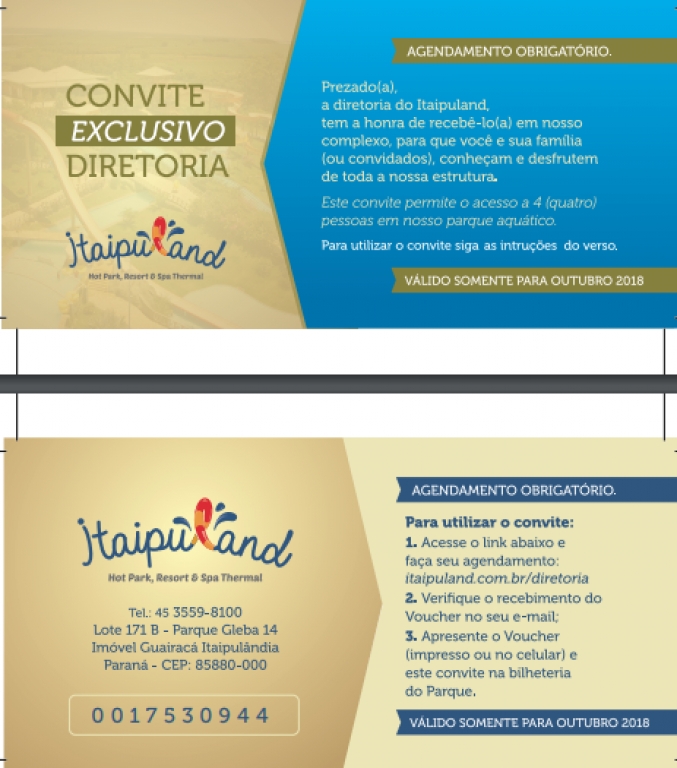 E cada convite dá direito de acesso ao Itaipuland Hot Park para até quatro pessoas.
